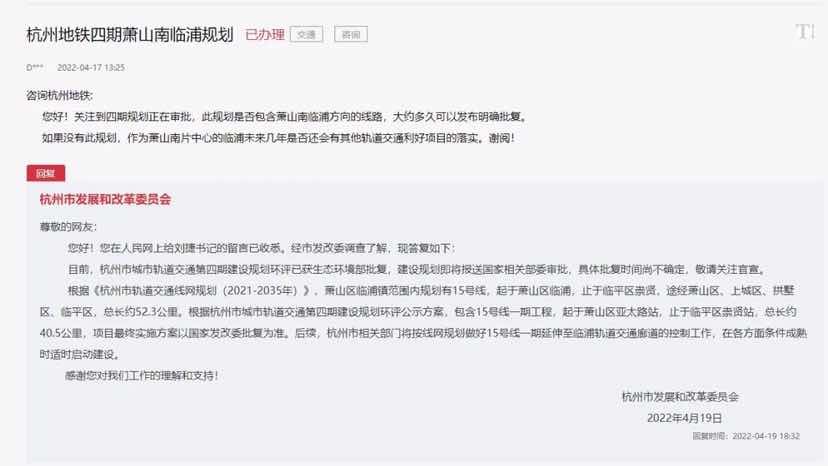 4月19日,杭州市发展和改革委员会给予了回复。回复中明确提到:“目前,杭州市城市轨道交通第四期建设规划环评已获生态环境部批复,建设规划即将报送国家相关部委审批,具体批复时间尚不确定,敬请关注官宣。”