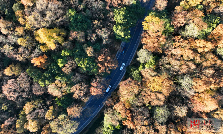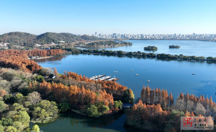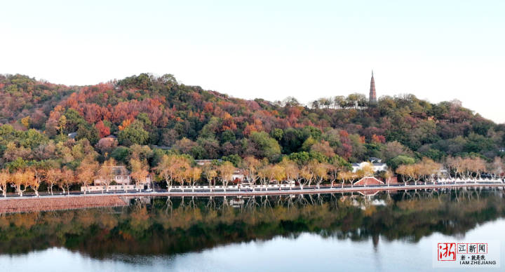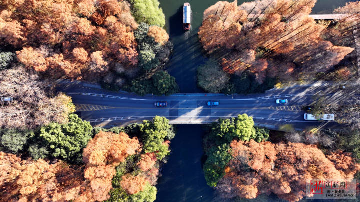 12月18日,杭城冬日暖阳,空中俯瞰西湖景区层林尽染,五彩斑斓,犹如大自然的“调色盘”,美不胜收。