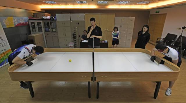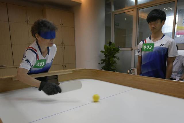 板铃球是一项适合视力障碍残疾人在室内开展的对抗性桌面运动项目,也是国际盲人体育联合会推荐的体育项目之一。比赛用球比乒乓球略大,内置小铃铛,滚动时会发出清晰的铃声,对战双方分立球桌两边,根据铃声判断球的运动方位,用球拍击打小球来进攻和防守。通过训练和对战,可提高盲人的听觉能力和协调灵活,达到健身和康复的目的,增进盲人间的交流,获得运动乐趣。