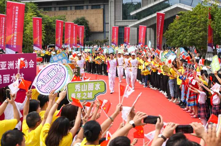 9月19日,杭州亚运会火炬传递衢州站,火炬手经过水亭门。记者 朱海伟 吕之遥 潘海松 摄