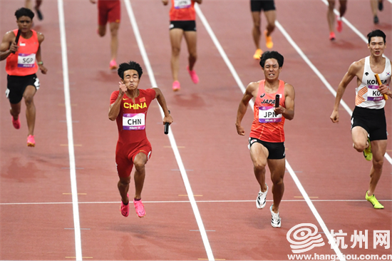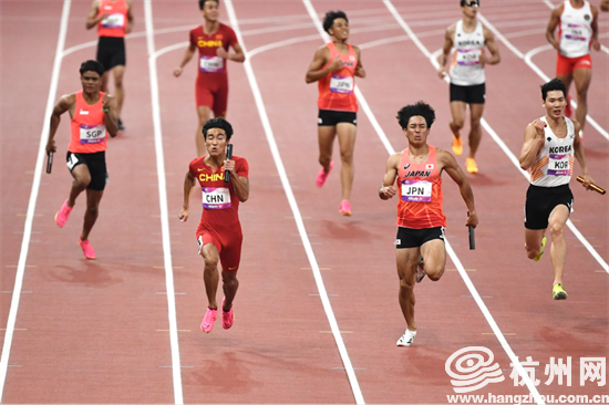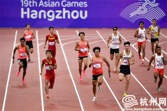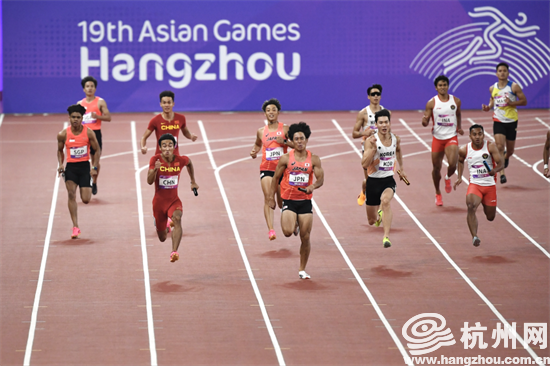 10月3日晚,杭州亚运会田径赛场上,男子4×100米决赛上演巅峰对决。