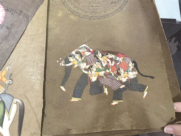 Pawan最擅长画的是宫廷题材,比如国王出行、宫廷生活、宗教故事等等。他把细密画画在古纸上,在上面用鲜艳的矿物颜料和金银勾勒填充之后,对比明显,充满了神秘的力量。