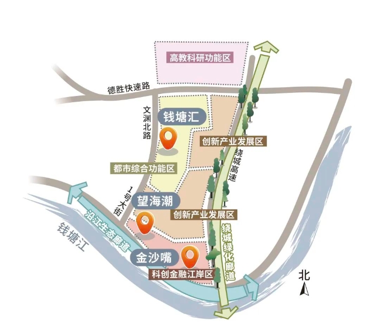 核心区域的取名充满杭州的人文气息——1号大街附近将打造集聚数字产业的创新基地和产城互融的示范社区,建设国际人才科创厅,名为“钱塘汇”;沿江南部,是离钱塘江最近的“望海潮”,与文化消费综合体相接,也将是东部湾新城的繁华之地;沿江东部,将重点招引总部企业,规划打造“超级总部中心”,未来,“金沙嘴”将是新一代总部集聚区杭州新名片。