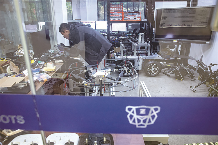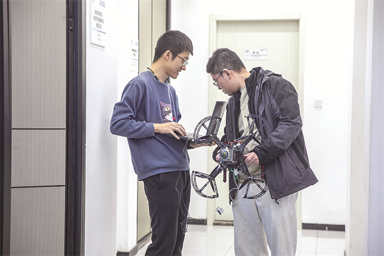 学生在机器人创新工坊做科研
