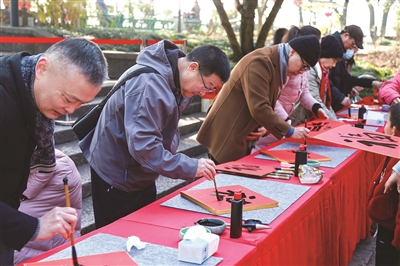 在“净宇江天”牌坊下,西泠印社的书法家吴莹、桑建华、柳晓康、陈峰、沈正宏为市民游客挥毫泼墨、提笔书福,为新的一年添个好彩头。