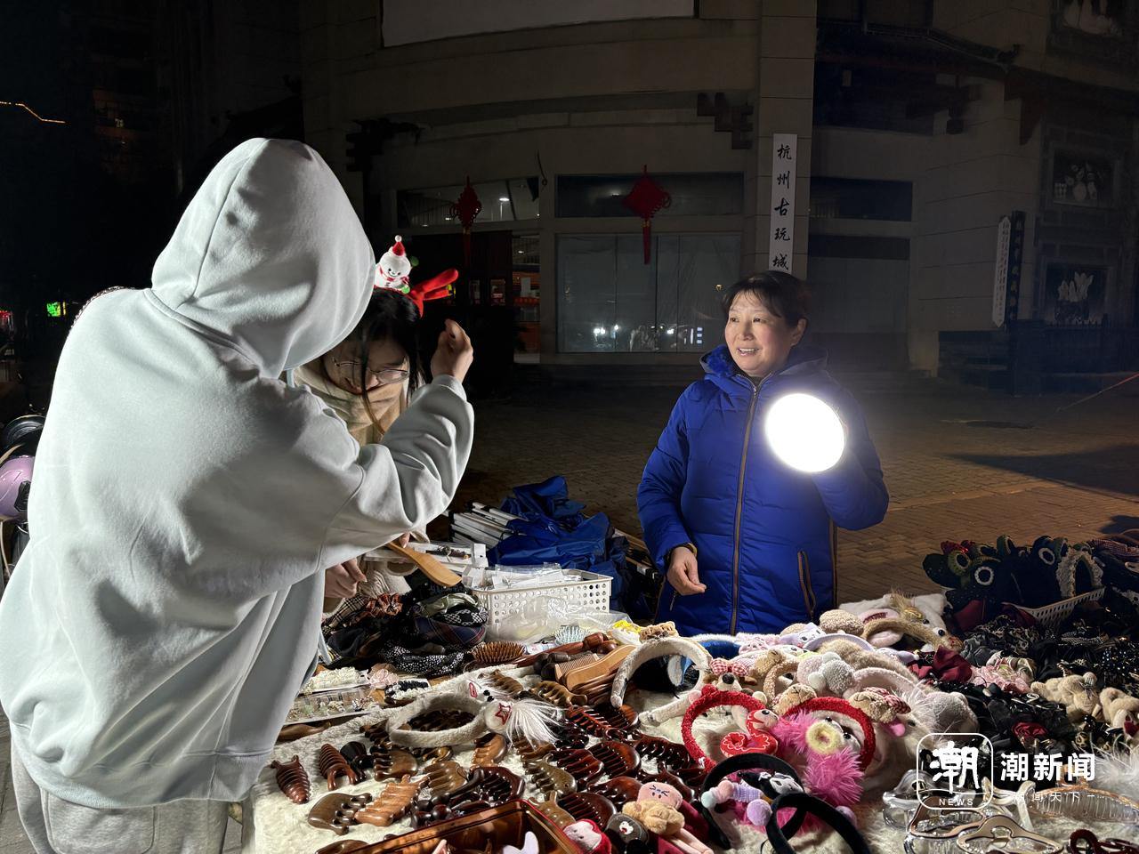 当天气温低,路上行人寥寥,到了晚间7点尚未“开张”,李大姐搓着手有些无奈。终于有一对年轻情侣上前挑簪子,李大姐忙不迭摊开一个放在一角的小盒子,还从一旁丈夫的摊位上转过灯来,为客人照明:“今晚灯光不好,这样亮些……”客人临走,她又热络地掏出几根小皮筋塞到女孩子手里,真诚感谢对方让自己开了当天第一单。