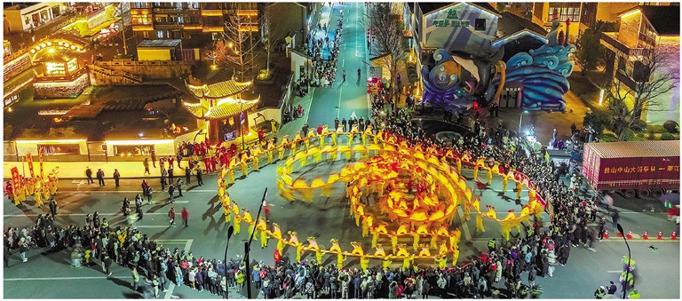 瓶窑老街的“瓶日好市”市集别具风情。板凳游龙队伍穿梭,舞者步伐轻盈;花灯巡展队伍所到之处,人群一片欢腾;古风民谣比赛吸引了众多音乐爱好者一展歌喉……