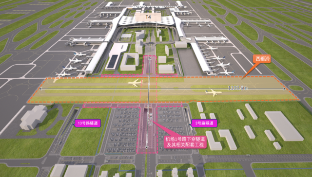 其中西垂滑包含两条E类垂直联络道,联络道长度1100.5米,间距76米,可同时保障2架A350大飞机滑行;机场1号路下穿隧道主线全长525 米,为双向8车道,设计车速60公里/小时。