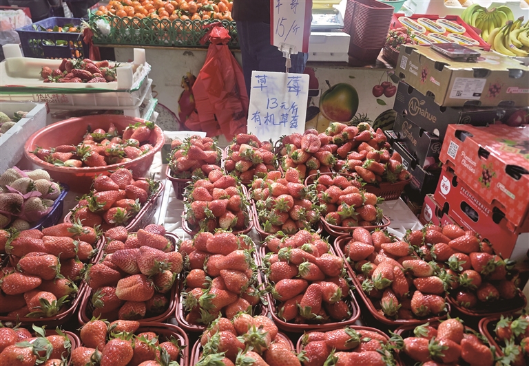 除了春笋外,很多市民手里还提着一篮草莓。最近草莓的价格同样很亲民。记者在市场二楼的水果区了解到,当前市场上销售的草莓以红颜草莓为主,有的摊位还特地标注售卖的是有机草莓。在其中一个摊位上,记者看到,有机草莓个头小一点的13元/斤,大一点的15元/斤,鸡蛋大小的草莓23元/斤,精品红颜草莓25元/斤……