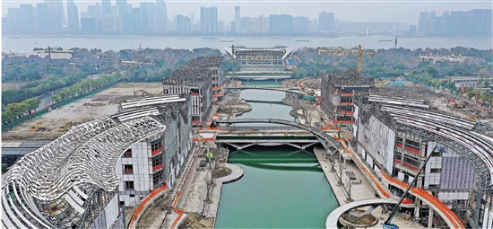 2月25日,在杭州钱江世纪城滨河数字产业园(水云间)项目现场,工人们正进行建筑幕墙安装及室内装修等施工。目前,该项目已完成主体验收,预计今年年底竣工。滨河数字产业园(水云间)项目占地面积约2.7万平方米,依河而建,以“涟漪水波”为主要设计元素,打造集科技文化、都市生活、时尚旅游于一体的文化新地标。