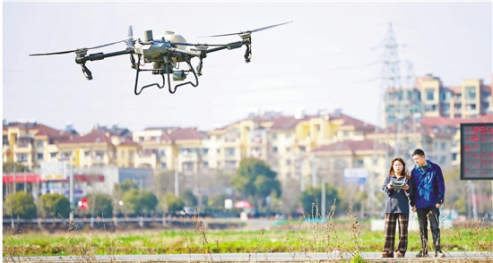 在杭州市桐庐县横村镇东南村油菜种植基地上空,种植户在操控无人机进行追肥作业。