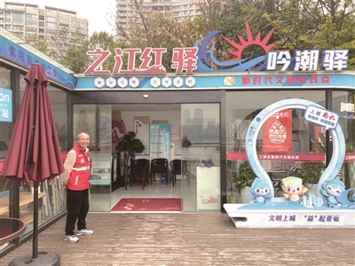 甬江路路口有个“驿站”,志愿者王江雄67岁,他说这里是紫阳街道总工会的“吟潮驿志愿者服务站”,在江边三年半了,他在这里当志愿者也有3年多。