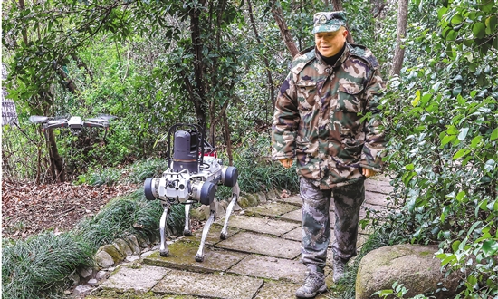 皋亭山护林员吴建忠与机器狗、无人机一同巡山。 本报记者 周逸 摄