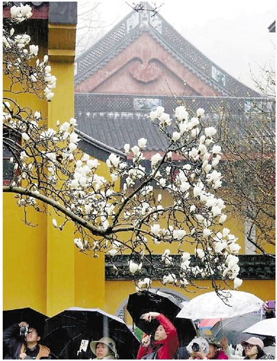 这几天,上天竺法喜寺的古玉兰树下热闹非凡,许多市民特地赶来赏花拍照。
