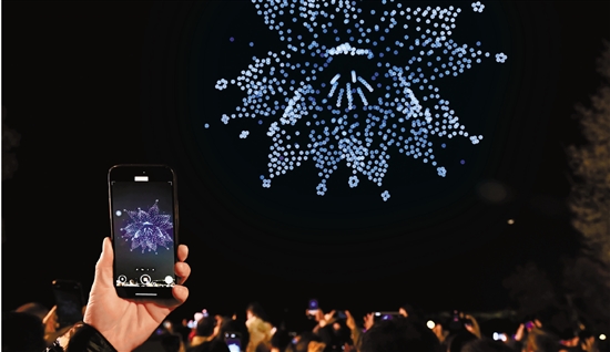 4月1日晚,杭州西湖音乐喷泉广场上演无人机表演。1500架无人机斑斓闪烁,在西湖上空不断变换队形组成各种图案,吸引市民和游客驻足观看。