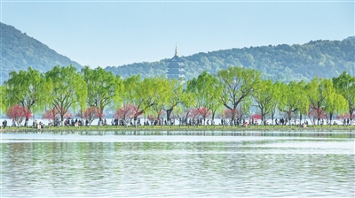 西湖白堤,桃红柳绿。 记者 陈中秋 摄