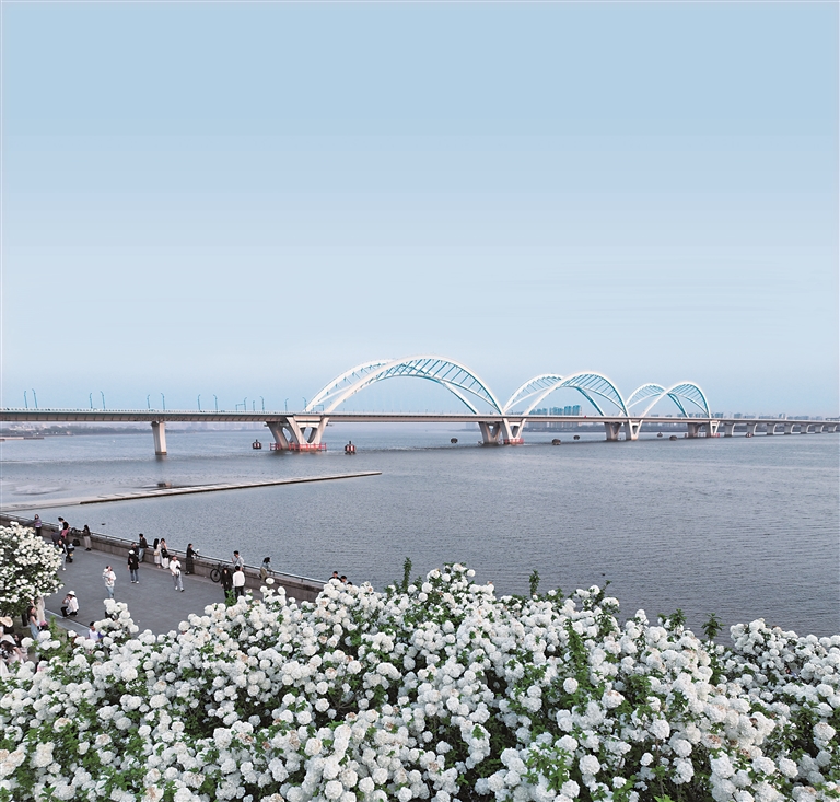 近日,九堡大桥下的木绣球花海已进入全盛期。绵延的白色花团与钱塘江景交相辉映,美不胜收,吸引众多游人前来赏花拍照。
