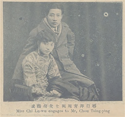 在周先生眼里,爷爷周郁年和奶奶戚若韵是一对文人伉俪。他们订婚时还登过报。1930年1月1日的《申报》和《民国日报》,都有《周青萍戚绿荷订婚启事》一文,《图画时报》上还有两人的订婚照。“这张照片,我找人通过技术手段修复了,对父亲和我来说也是一种怀念。”