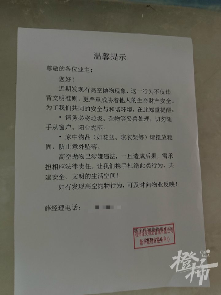 “前一两年也发生过这样的事,但都由于没有高空监控,拍不到,所以我们物业也很苦恼。”薛经理表示,事发后已经在二单元进行了高空抛物宣导。7月16日,在楼道内还张贴了“温馨提示”,提醒业主警惕高空抛物。