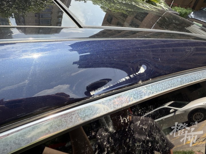 7月13日早上,张女士父亲在楼下看到自家车门顶部出现一道凹痕,一家人赶紧下楼查看。根据物业提供的监控,事情发生在前一天(7月12日)下午5点左右,一块条状砖块从天而降,但监控的角度只拍到了砖块掉落到地面的画面。