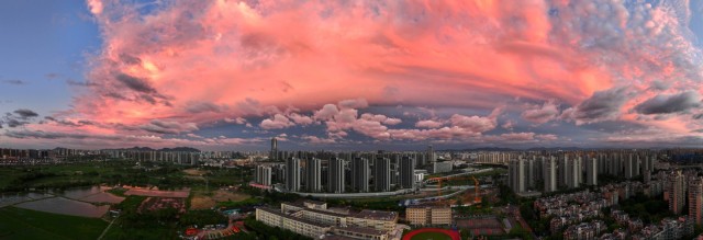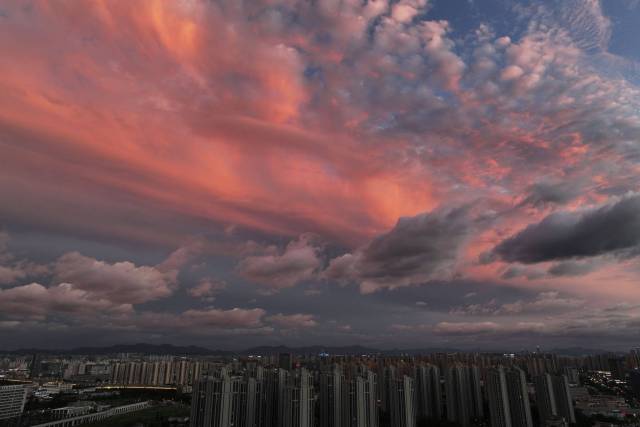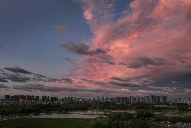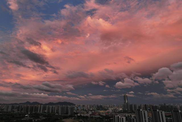 7月21日傍晚,夕阳映照天空,将快速飘移的台风云染成了粉红色,也为夜幕降临中的城市平添浪漫气氛。据气象播报,受今年第6号台风“韦帕”外围影响,刚刚入伏的杭州本周以多阵雨雷雨的天气为主,气温也将有所压制。