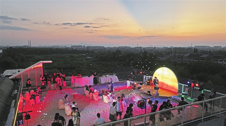 近日,大运河广济桥畔一幢老库房的屋顶上,一场“日落音乐会”在晚霞映衬下唱响,宣告由塘栖古镇老库房“破茧蝶变”而成的“稀隐HiiN艺术街区”(一期)绚丽开启。老库房位于塘栖古镇的北岸西侧,三幢老建筑建于20世纪50至70年代,曾是丝绸公司收购蚕茧的仓库用房。提升改造后的老库房建筑拥有约8000平方米的内部空间,精心设置天空之镜、秘境花园、高塔瀑布、日落长河等近100个打卡拍照场景。