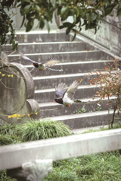 慧因高丽寺,在寺内觅食的红嘴蓝鹊。