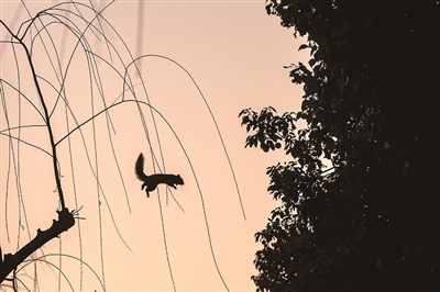 西湖边,一只松鼠在树间跳跃。