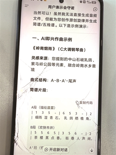 AI当即创作了一曲《岭南烟雨》,文中包含全先生前面提到的中山乳鸽、紫马岭公园等元素,还把曲谱、作品应用建议写得一清二楚。