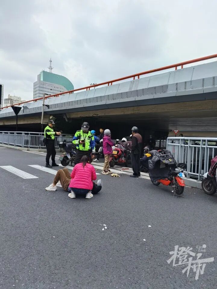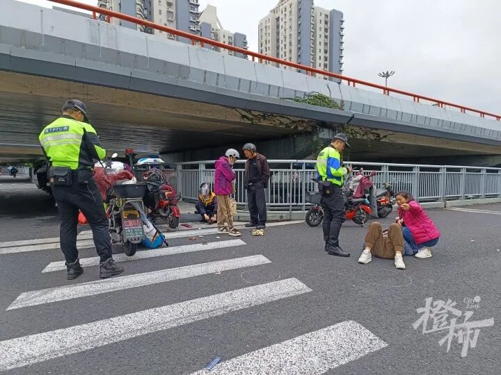 11日中午12点半,中河高架环北立交桥非机动车道上,两辆电瓶车相撞,两位骑车大姐倒地受伤。