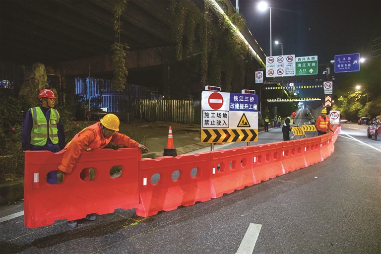 今天零时,钱江三桥改建提升工程正式实施全封闭断流施工。