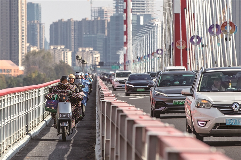 骑车的市民通过钱江三桥非机动车道过江