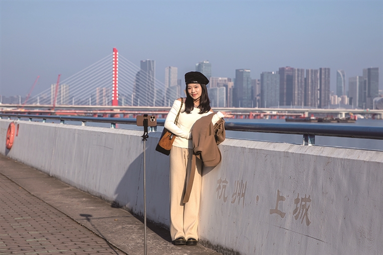 住在滨江的丁祎雯,在一家美妆公司工作,也是一位短视频博主,她特地开车走了一趟钱江三桥,来到钱塘江北岸,在桥下找各种角度,自拍照片和视频,准备发到自己的社交平台。