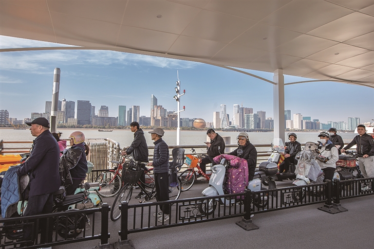 市民在钱塘江南岸奥体中心渡埠等候上船