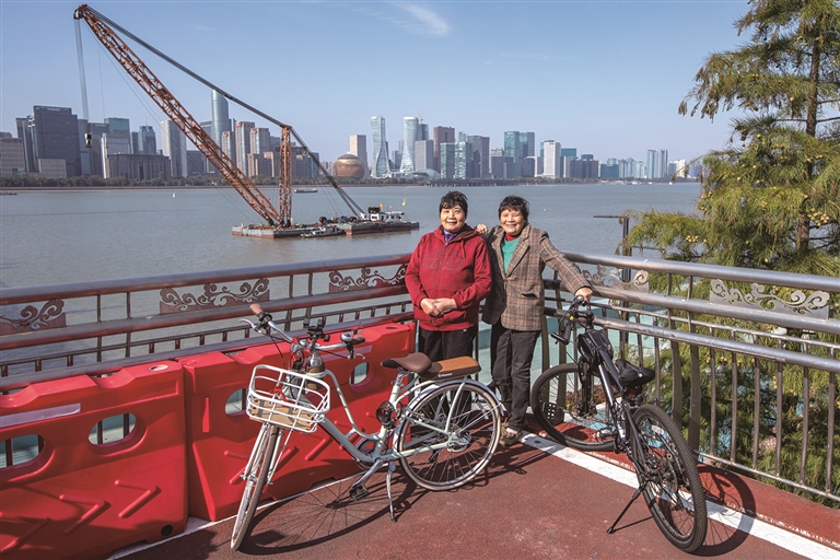 陈美娟(左)、陈美员姐妹在钱江三桥非机动车坡道转角合影