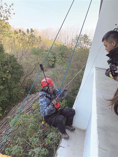 记者在体验缓降器逃生