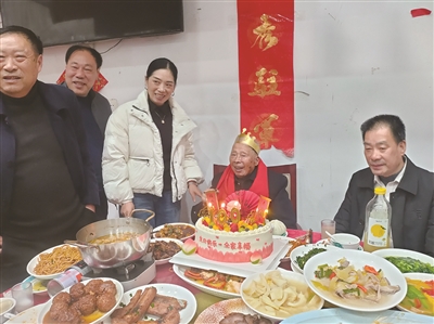 “银根哥福气好啊,活到100岁真是有福啦”“送到家里的长寿面都收到了,谢谢哦”“福寿绵长,身体健健康康的哦”……酒席间,村民们端起酒杯争着抢着上前为老人贺寿,老人眼神清亮,只是耳朵有些背,大家都贴着耳朵把祝福的话喊了出来。