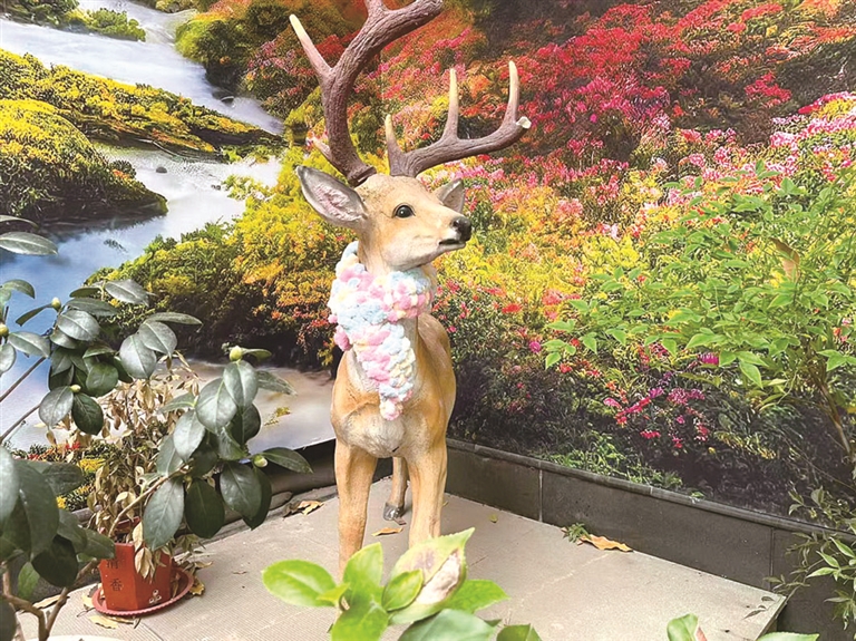 大树旁的小鹿雕塑,是大家格外喜爱的伙伴,想着寒冬将至,也给它织了一条绚丽的围巾。