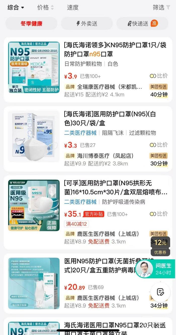 相比线下门店,线上购买N95口罩会方便许多。在一些外卖平台的“看病买药”专区搜索“N95口罩”,可以看到不少门店仍有货在售,每只口罩的价格从1至5元不等。线上下单后,会有骑手配送到家。