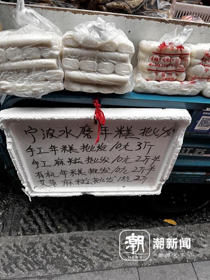 “前阵子普通宁波年糕批发价2.5元一斤,现在涨了一点,但和去年差不多。” 摊位老板娘一边整理着年糕,一边告诉记者,“我们卖的都是传统水磨年糕,纯手工制作的。”