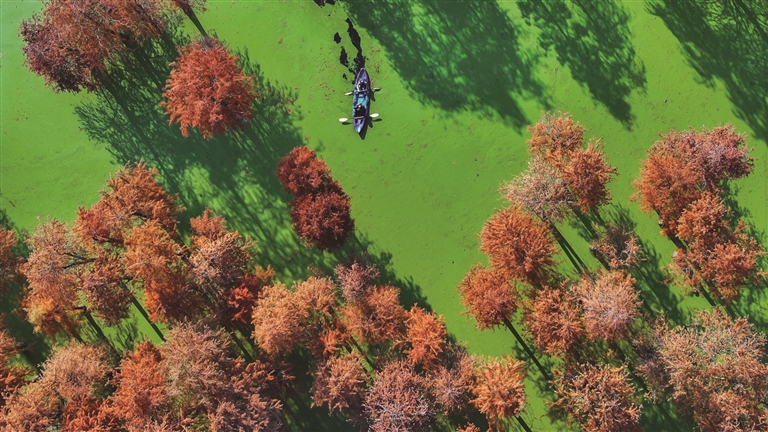 “杭州有片焦糖色的抹茶森林!”最近,这句话在互联网上火了,这片森林指的是12月份的青山湖。眼下,杭州青山湖水上森林已进入红杉的最佳观赏期。上万棵杉树褪去青绿,染上金色、橙红、焦糖的渐变色彩,与铺满碧绿浮萍的湖面相互映衬,勾勒出一幅层林尽染的诗意画卷,吸引众多市民游客前来赏景拍照。这番美景预计可持续到12月底。