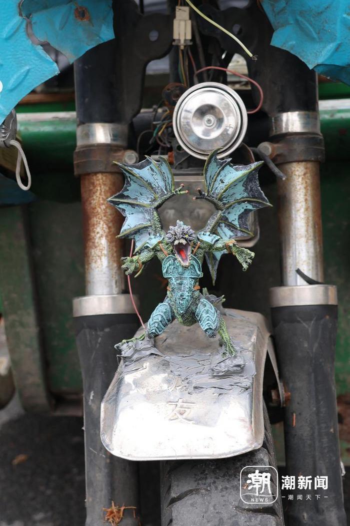每一个玩具,都被郏德轩精心摆放在合适的位置,比如,前轮的挡泥板上就放着一只恶龙摆件,车挡风玻璃两侧也被放置着龙形玩具,“嘴巴里的龙珠,是从别的玩具里弄出来的,我觉得蛮有意思。”