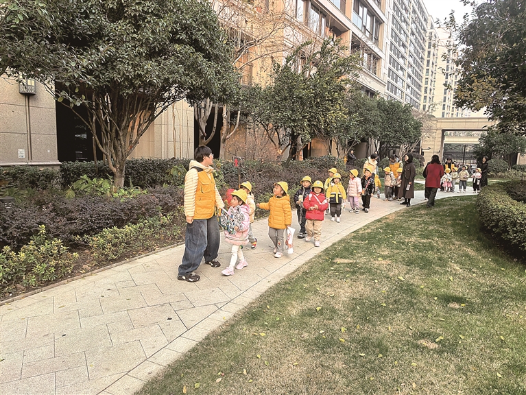 “路线规划,安全永远是第一位的。”金海塘幼儿园园长徐炜介绍,设计路线时,园方特意避开了车流密集区域,同时尽可能串联起小区内的绿化景观与公共空间,让短短一段放学路,变身成轻松有趣的“微研学”之旅。“我们不仅要保障孩子安全、方便家长接送,更希望借助沿途的自然与社区资源,让孩子们在行走中有所收获。”