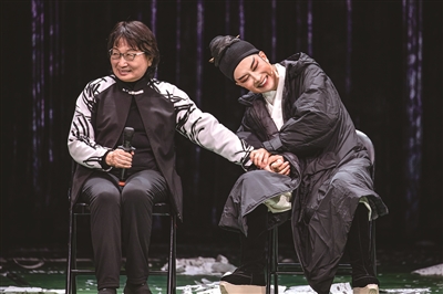 越剧《苏东坡》演后谈环节,茅威涛与编剧何冀平谈笑风生。