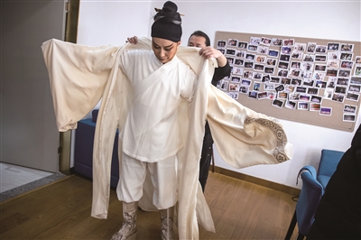 越剧《苏东坡》演出前,茅威涛在后台换装。