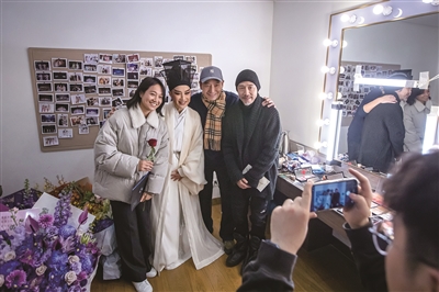 越剧《苏东坡》演出结束后,茅威涛回到后台,与前来探望祝贺的戴军、朱丹等友人合影。