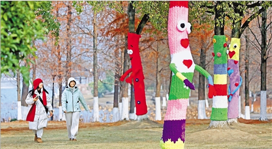 1月6日,杭州市萧山区湘湖翦波桥畔的22棵树披上了手工编织的“毛衣”,为冬日增添了一抹温暖亮色,吸引游人拍照留念。