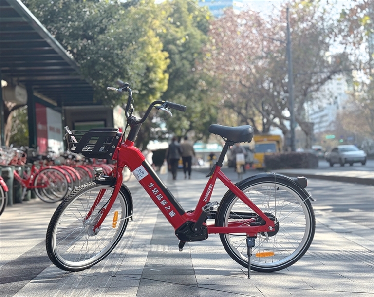 昨天上午,我来到体育场路武林广场南公交站附近的公共自行车租赁点。一排小红车里,多了一种看起来“有点不一样”的——车身更厚一点,车架更结实,还安装了黑色电池的助力小红车。