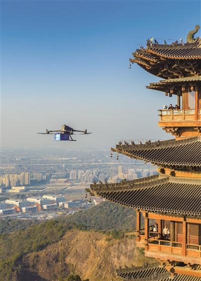 图为昨天无人机正将外卖配送至望宸阁的“空投餐厅”。 通讯员 余文华 记者 项凯 摄影