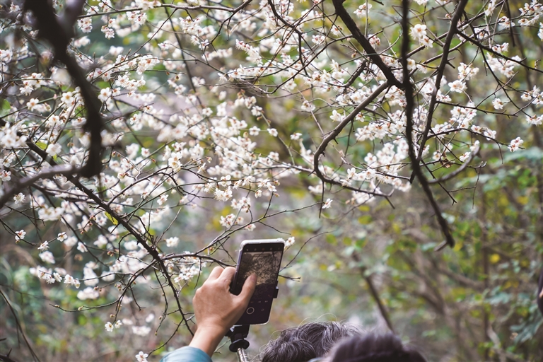 这几天的杭州,暖得超乎寻常,温暖的天气里,杭城的梅花也开得格外热闹。昨天,上城区凯旋公园内,一株白梅花开正盛,远看仿佛点点云絮,近看如同雪落枝头,洁白纯粹,清香阵阵,几只蜜蜂飞舞其间,构成一幅淡墨山水画,吸引不少摄影爱好者前来定格美好。